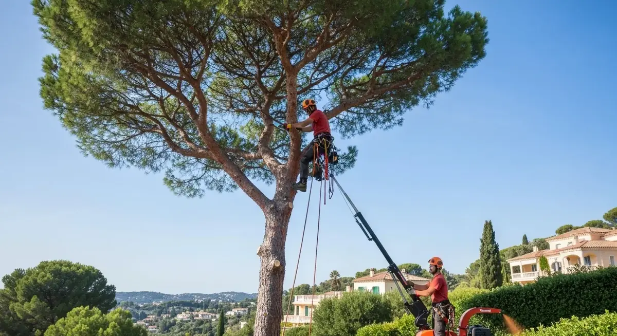Oliviers, palmiers royaux, cyprès méditerranéens, chênes verts, pins d'Alep — toutes les essences de la région. Grimpe encordée, nacelle, perche.